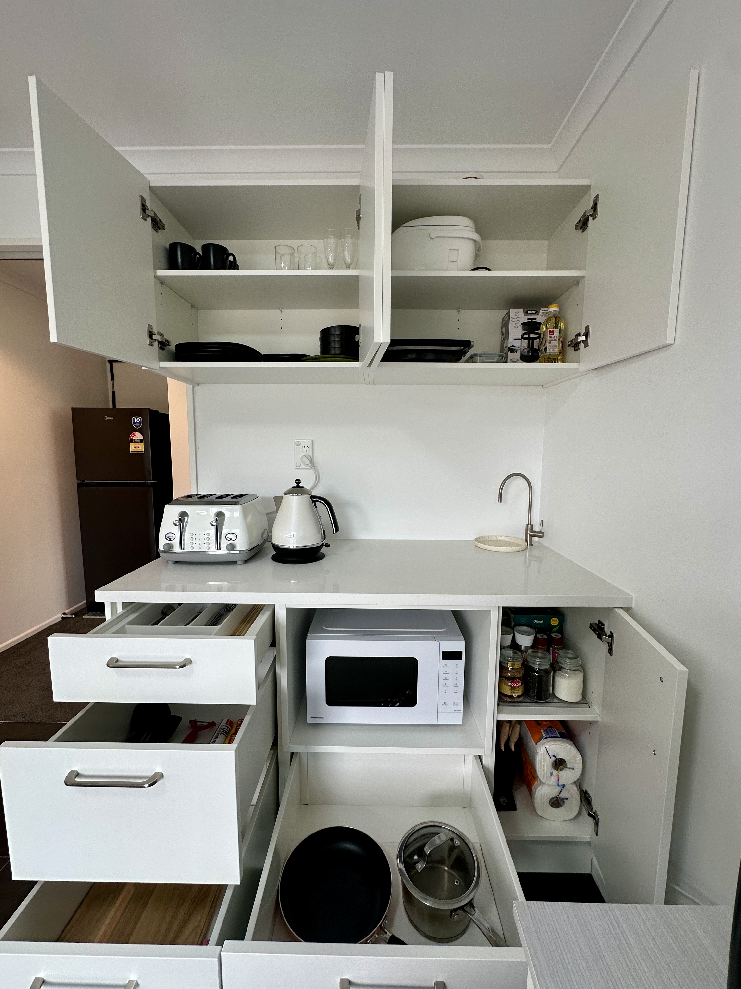 Children's high chair, Cooking utensils, Kitchenette, Microwave, Mini Oven, Oven Stove, Refrigerator, Rice steamer, Spices, Toaster, Vacuum cleaner, Water purifier